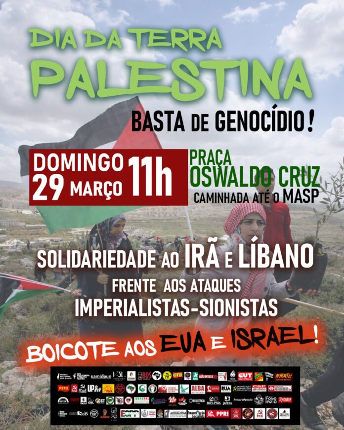 Será a primeira mobilização de 2026 em apoio ao povo palestino e contará com a participação de entidades sindicais, grupos da sociedade civil (Frente Palestina, BDS, Vozes Judaicas pela Libertação, Coletivo de Jornalistas Shireen Abu Akleh etc.) e partidos políticos de esquerda.