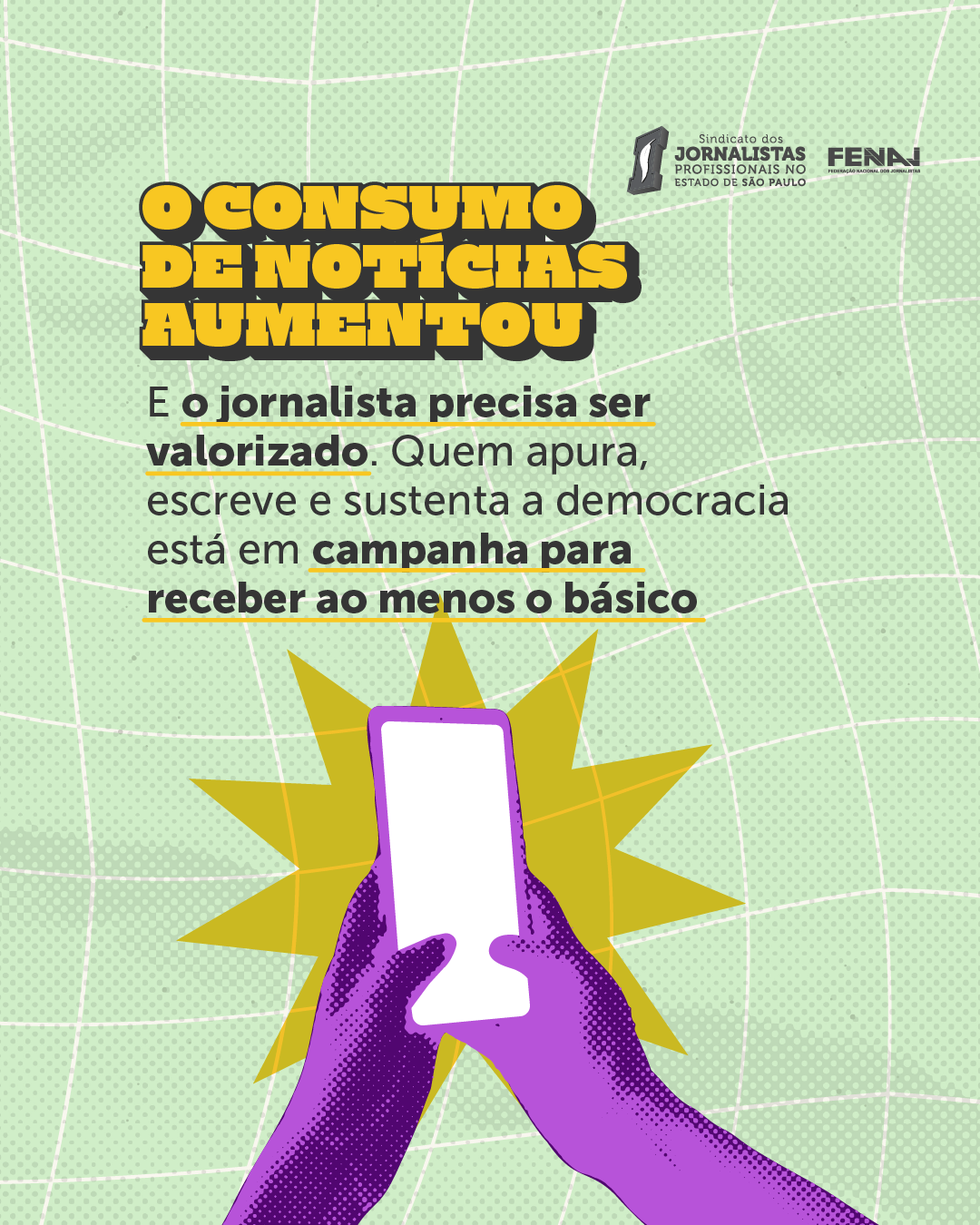 “A inteligência artificial pode gerar narrativas, mas só jornalistas relatam fatos com responsabilidade. Enquanto o consumo de notícias cresce, os donos de jornais e revistas se recusam a valorizar quem garante esse trabalho”, afirma a campanha nas redes.