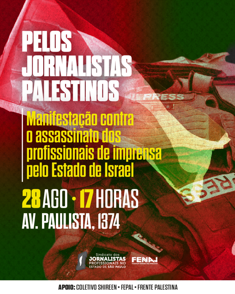 O Sindicato dos Jornalistas Profissionais no Estado de São Paulo (SJSP) e a Federação Nacional dos Jornalistas (Fenaj), com apoio de diversas outras entidades e coletivos, convocam colegas jornalistas para que participem, nesta quinta-feira 28 de agosto, às 17 horas, de um dia de luta contra a matança de jornalistas palestinos(as) por Israel, bem como contra o genocídio perpetrado por Israel na Faixa de Gaza, que já provocou mais de 62 mil vítimas fatais e cerca de 150 mil feridos.