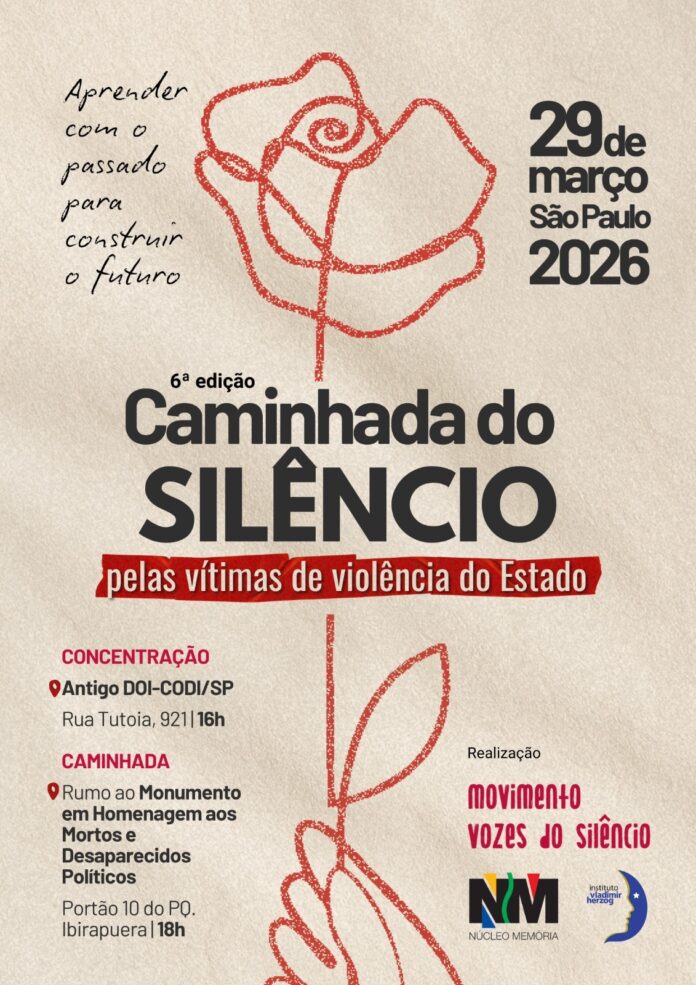 No dia 29 de março, um domingo, ocorrerá em São Paulo a sexta edição da “Caminhada do Silêncio pelas Vítimas de Violência do Estado”. A concentração inicial dos manifestantes será às 16h e ocorrerá em frente à sede do principal centro de torturas da Ditadura Militar (1964-1985): o antigo “Destacamento de Operações de Informações do Centro de Operações de Defesa Interna”, o DOI-CODI do então II Exército, situado na rua Tutoia 921 (Vila Mariana), às 16h.