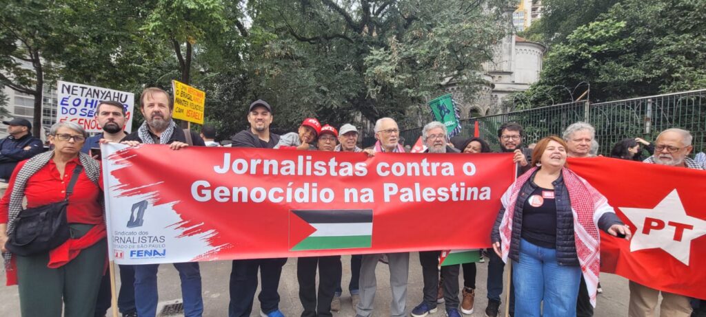 Durante o ato, diversos discursos destacaram o papel dos jornalistas palestinos, que, mesmo sob risco de morte, continuam registrando e denunciando os horrores do conflito. Até o momento, “Israel assassinou, deliberadamente e de modo covarde, 225 jornalistas palestinos(as), bem como cerca de dez jornalistas do Líbano e da Síria”, denuncia Pedro Estevam da Rocha Pomar, secretário de Formação Sindical e Profissional do SJSP e integrante do GT Palestina.